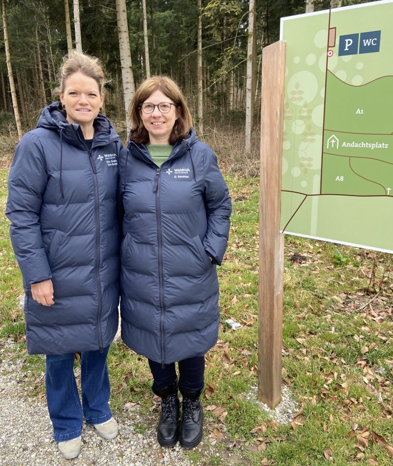 An einem kühlen, windigen Morgen bin ich mit Christiane Gräfin von Spreti und Daniela Seichter vom Team der „Waldruh Mammendorf“ verabredet. Wir treffen uns auf einem Parkplatz mitten im Wald, nur etwa zehn Gehminuten vom Bahnhof Mammendorf entfernt. Die beiden Frauen, eingepackt in Daunenjacken mit Firmenschriftzug und ihren Namen, führen mich durch den im August 2025 eröffneten Bestattungswald.